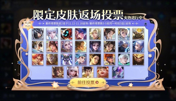 2、最终得票数第3-5名的皮肤将于2022年11月12日-11月18日返场,玩家可以从这三款皮肤中任选一款购买,且每个游戏角色仅可购买其中一款