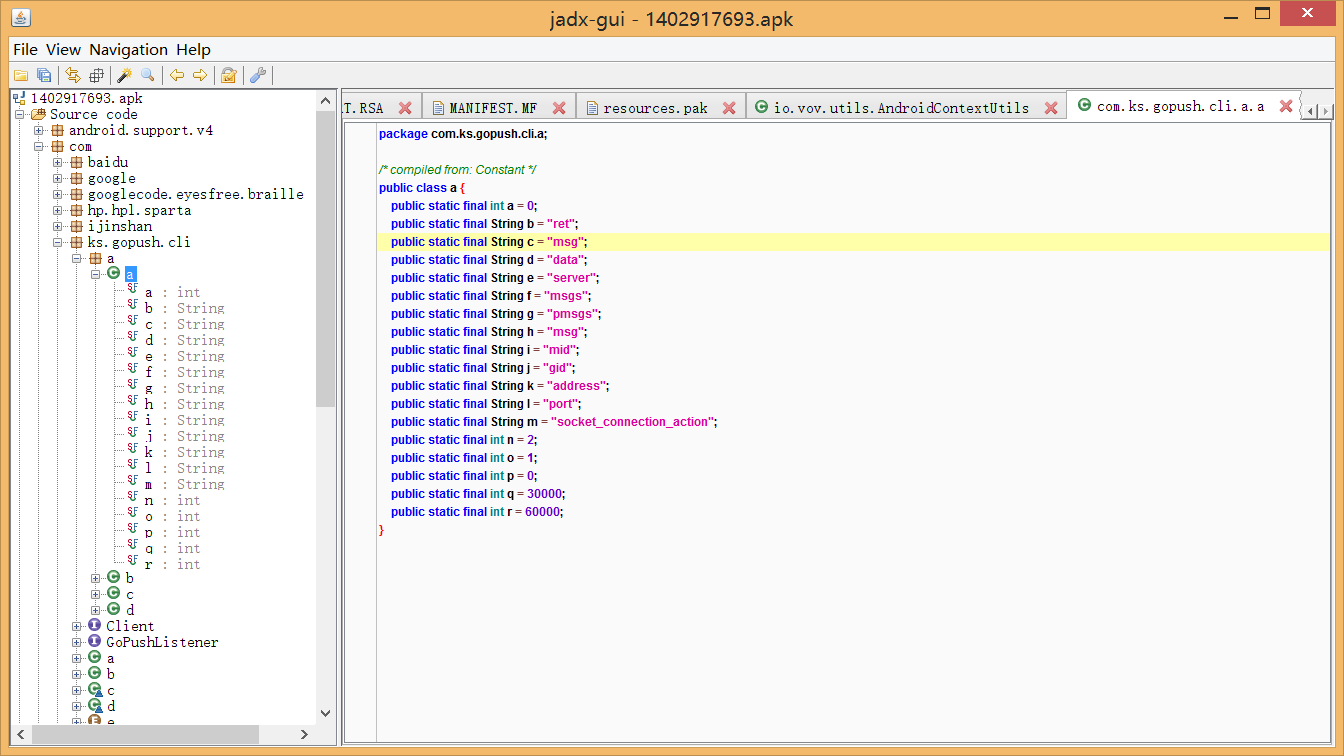 jadx是一款Android反汇编gui专用工具,它适用apk、dex、jar、class、zip、aar等文档。jadx实际操作便捷,反汇编后的编码易读性高,另外还有着较健全的gui界面,去除搞混一部分的编码,jadx早已十分贴近源码了。