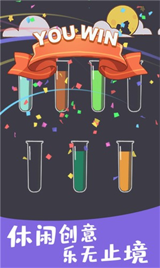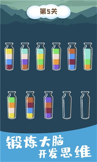 这款游戏采用简约风格的画风,加上简单的操作方法,让玩家享受解谜的乐趣,丰富多样的玩法等你来挑战,乐趣十足。丰富多样的关卡,玩法简单易上手。相同颜色的水只要分类倒入同一个杯子,就能轻松过关!是不是很简单?玩家只需要把杯子里的水按照颜色分类,这样不同颜色的水会聚集在同一个杯子里。游戏设计了非常丰富的关卡,是一款具有挑战性和休闲性的迷你游戏。还能在娱乐的同时锻炼大脑。游戏有很多关卡,每个关卡都有不同的通关条件。而且你需要在闯关的时候根据水的不同颜色进行排序,保证每个水杯里的水都是同一个颜色,这样才能顺利过关。当然越往后越难走!