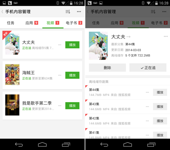 如果有已经追的电视连续剧,在「手机上内容管理系统」的「视頻」内容下就可以立即收看啦!