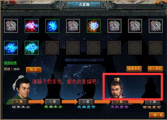 客户能够根据占星学阁开展卜算,观星阁现有5位占卜师,每一个占卜师所得到的星曜质量不一样。向越靠后的占卜师开展卜算,所得到的橘色星曜的概率也就越高,朋友们给油啦!你能挑选一个个点一下的方法奇迹时刻发生的時刻,还可以应用“一键卜算”的作用,快,狠,准!