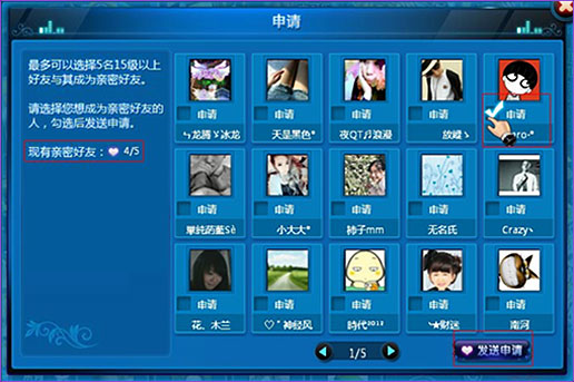 挑选一个朋友,在他的头像图片下打钩“√”。点推送申请办理。(留意哦数最多五个亲密无间朋友)