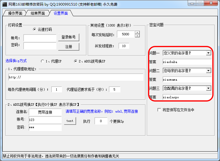2、设定拔号、打码软件及其密保问题等有关主要参数