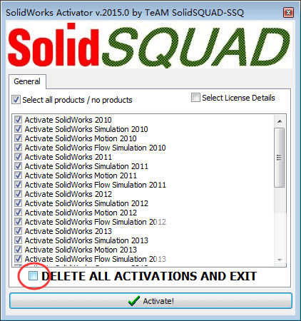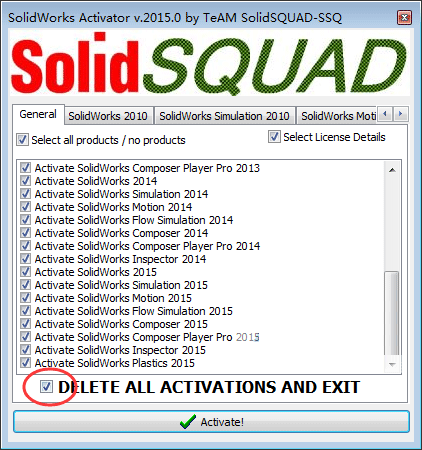 2、不管你之前是不是安裝过Solidworks,我都提议运作SW2010-2015.Activator.GUI.SSQ,勾图中中选择项,并点一下activta消除老总受权。