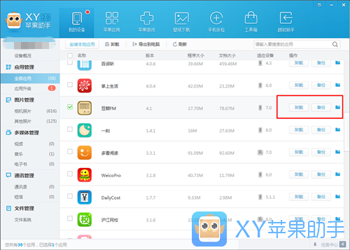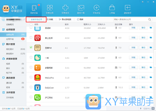 1.开启XY苹果助手,将手机上根据USB线联接至电脑上,待XY苹果助手鉴别出手机上。在网页页面左上角有“程序管理”这一栏,里边表明了手机上中当今全部的运用数,与必须升級的运用数。