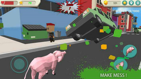疯狂猪模拟器的游戏很解压,很有趣。玩家将操纵一只疯狂的小猪在城市里跑来跑去,见到东西就破坏。你破坏的越多,你得到的金币就越多。疯狂猪模拟器场景丰富,玩家可以操纵你的小猪自由探索城市的每一个角落,在这里无论是车辆还是建筑都可以被随意摧毁。这里还有各种小猪皮,玩家可以收集更多小猪来体验。