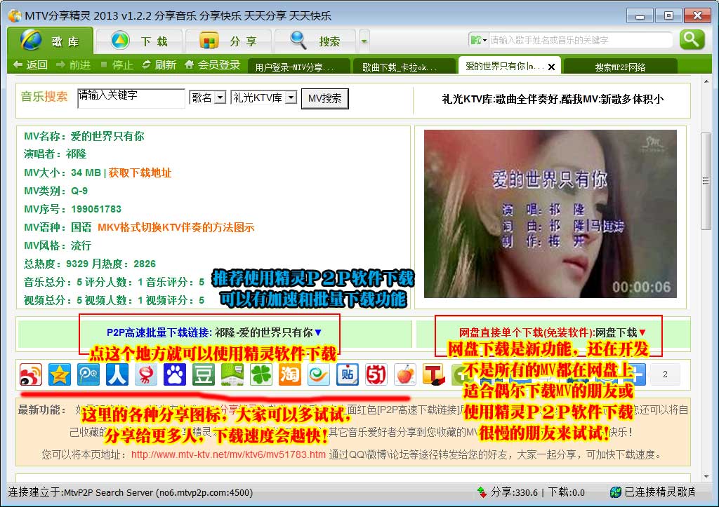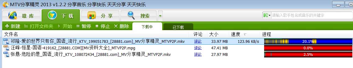 《MTV分享精灵》是着名的高品质MTV下载应用《MTV下载精灵》的P2P版,通称MTVP2P。手机软件根据全世界最著名的eDonkey2000 network和Kademlia network互联网科研开发,便于将大家“共享歌曲,传递快乐”的核心理念遍及四方,让全世界全部喜爱歌曲的小伙伴们省时省力地共享收藏的歌曲。