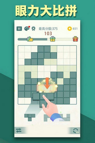 3.头脑风暴,酷炫消除:经典拼图游戏,拖动方块到棋盘上进行拼接消除,消除特效华丽酷炫,闪瞎你的眼睛。