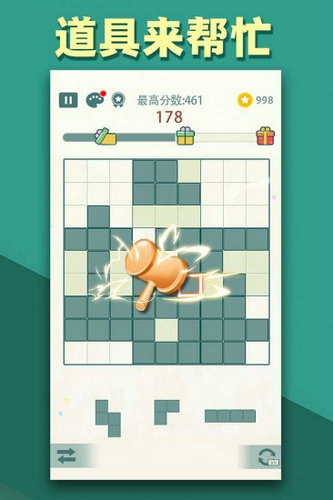2.用不同形状的方块填满棋盘中任意九个方块或九行,消除分数。