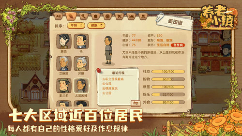 养老小镇游戏是一款轻松有趣的训练模拟游戏养老小镇。在这里,玩家需要把这个小镇建设好,完成更多的任务,制定丰富的发展规划,制定一些政策,让所有的老人都有安全感。在这里玩家也需要培养自己的兴趣爱好,才能让所有的老人开心安心。玩法丰富多样,等你来体验。