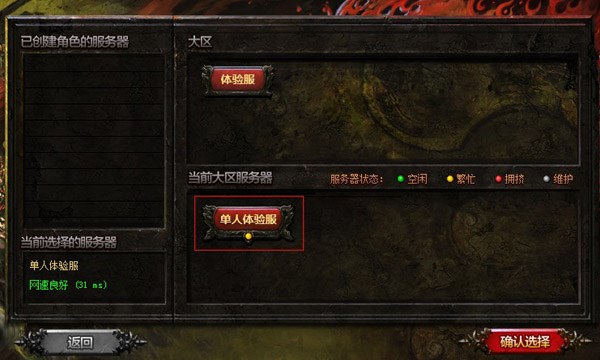 2、在挑选服务器的页面,挑选“單人体验区”,再点一下“确定挑选”就可以开始游戏。