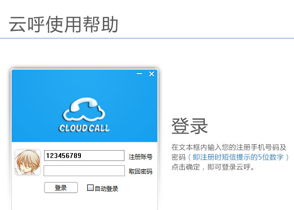 在输入框内请输入的申请注册手机号及登陆密码(即申请注册时短消息提醒的5位数据)点一下明确,就可以登陆云呼。