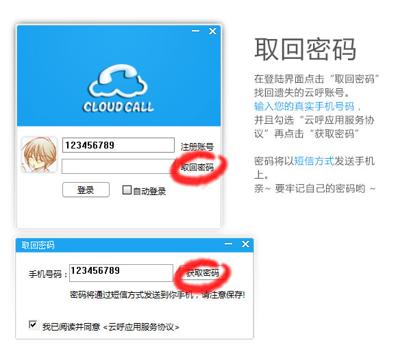 在登陆界面点一下“取回来登陆密码”找到丢失的云呼账户。