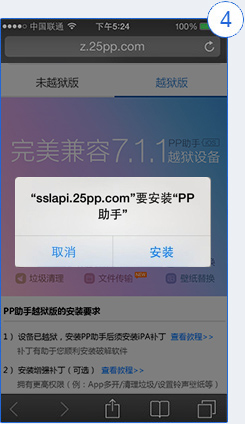 2、安裝PP小助手机器设备务必早已苹果越狱,而且早已安裝iPA补丁下载;如何越狱? 如何安装iPA补丁下载?