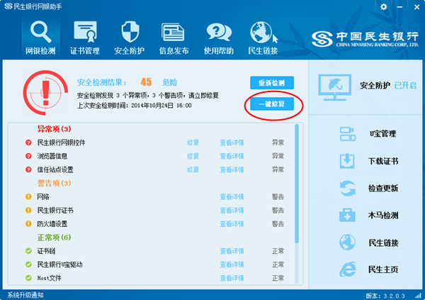 若检验結果中有什么问题必须恢复得话,请点一下“一键修复”,恢复进行后再应用网上银行。