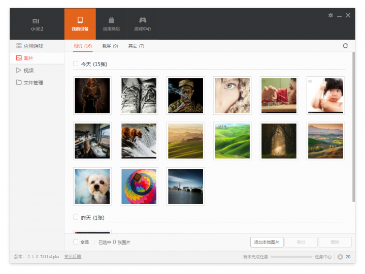 ▼ 全新升级重新构建、全新升级设计方案的小米助手主界面,beta版的管理方法作用为运用游戏管理,图片管理,视频管理,文件夹管理。备份数据、复原、升級、一键刷机作用迁移来到右上方~