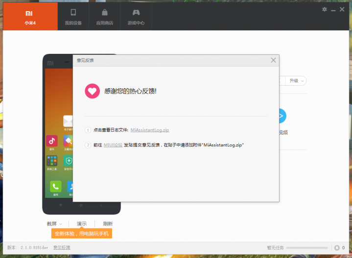 ▼应用全过程中出現一切难题,点一下主界面左下方的“反馈意见”,依照提醒将你的log文件递交在贴子中,开发设计组会立即回应解释你的问题。