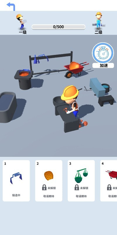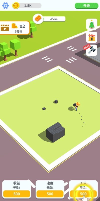 2.按照任务提示完成关卡中的建设目标。点击屏幕可以加速工人,升级工人可以增加搬砖的数量和速度。