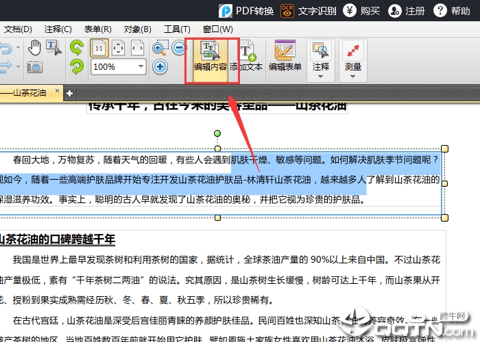 2、将PDF文档开启之后,必须点击上边的“编写內容”选择项,那样就可以选定必须改动的PDF文本,对PDF文本內容开展编写改动了。
