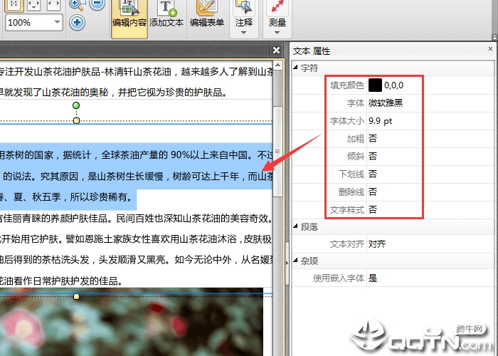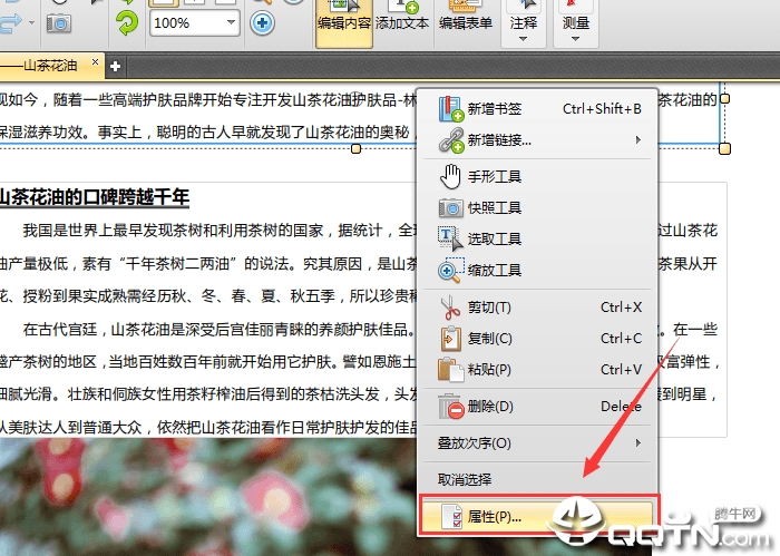 3、假如要想对PDF文本的文件格式开展编写改动,那麼必须点一下鼠标点击,随后选定里边的“特性”作用,在软件右边开启特性页面。