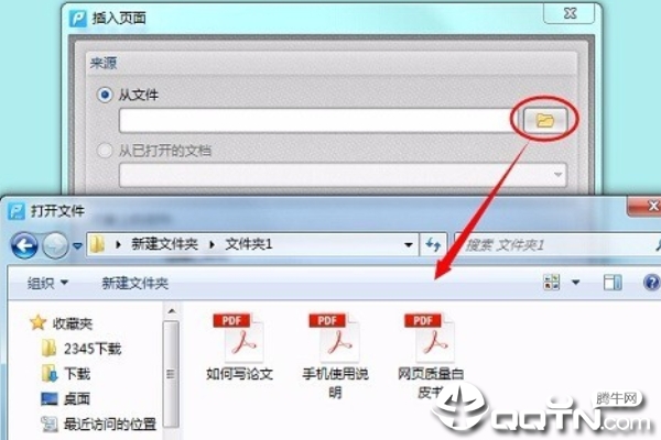 3、随后在开启的插进网页页面提示框的来源于选择项中挑选“文本文件”,并点一下后边的文件夹名称按键,挑选必须开展合拼的另一个pdf文件。