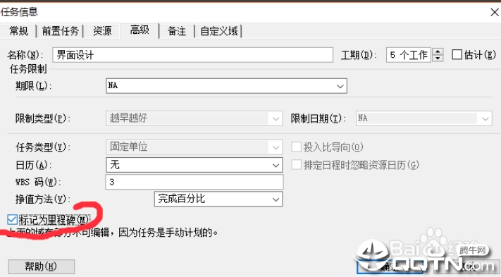 4、随后将每日任务信息内容对话框中的菜单栏转换到高級选择项,启用【标识为里程碑式】选择项。