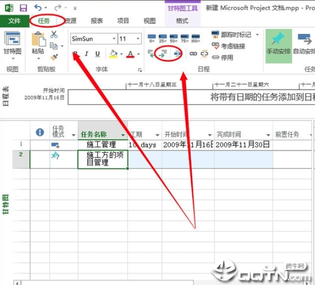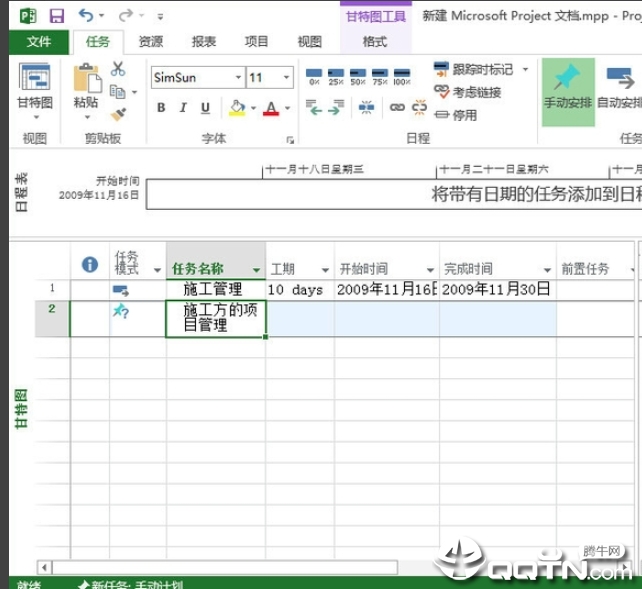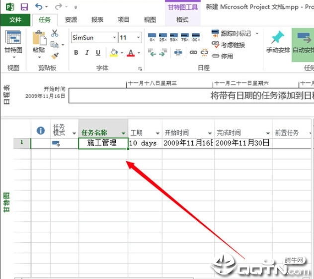 1、开启新创建的project2010新项目,点一下每日任务名字单元格,新创建第一个主每日任务。
