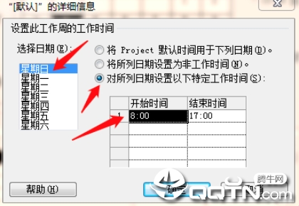 4、随后进到详细资料页面,挑选日期是【礼拜日】,挑选【对列出日期设定下列特殊上班时间】挑选开始时间和完毕時间。挑选进行后点一下【明确】就可以了。