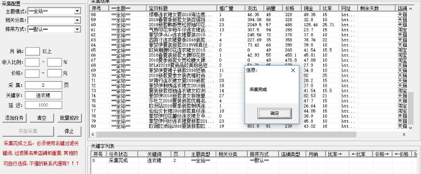 键入卖家旺旺,可依照销售量和价钱开展收集,一键进行收集,并可将結果导出来为目录,智能化过虑违反规定词