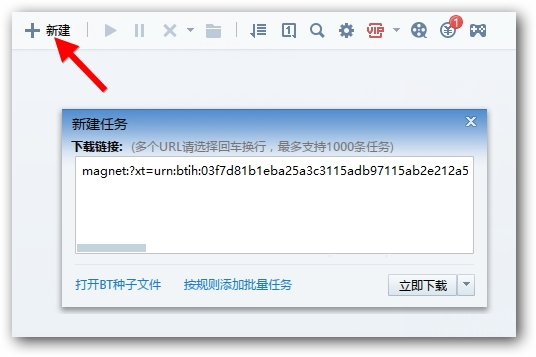 2.2、假如你的迅雷资源沒有打开,只有开启迅雷资源,点一下新创建按键把拷贝的“磁力下载”填写弹出来的文本框内,点一下“点击下载”就可以。